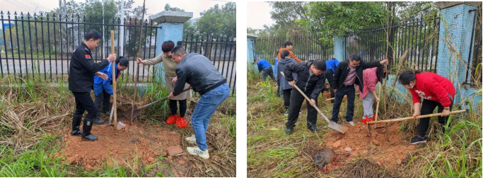 動員結(jié)束后,大家紛紛帶好工具,前往種植地點(diǎn)。所有人分工合作:規(guī)劃位置、測量尺寸、揮鍬鏟土、扶樹填坑、踏土夯苗、配合默契……紛紛為建設(shè)"綠美廣東"貢獻(xiàn)出自己的一份力量。