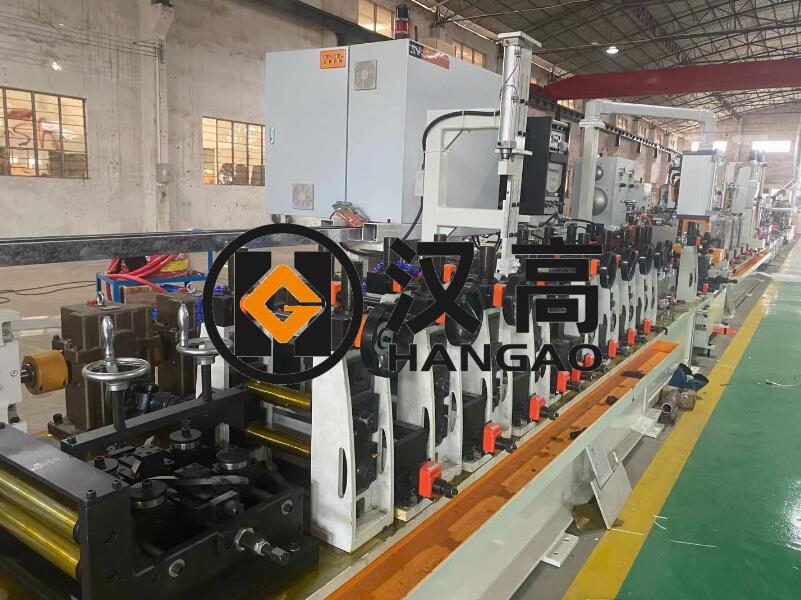 通過上料機(jī)將帶料引入焊管機(jī),通過輥輪將帶料擠壓成形,然后用砑弧焊混合氣體保護(hù)焊接、校圓,輸出需要長度的管材,切刀機(jī)構(gòu)切斷,再經(jīng)調(diào)直機(jī)調(diào)直。點(diǎn)焊機(jī)用于帶料頭之間進(jìn)行點(diǎn)焊連接。該型制管機(jī)是將帶料連續(xù)不斷的焊接成管材,并校圓調(diào)直的綜合性的成套設(shè)備。