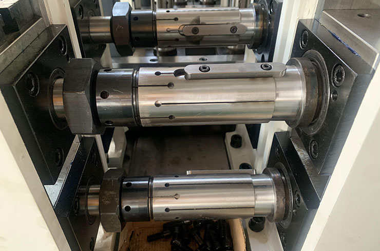 2.立輥機(jī)架加工精度都有保證的前題下,我們創(chuàng)新設(shè)計(jì)了,像水平機(jī)架類式的結(jié)構(gòu)。軸兩端安裝軸承,U形固定軸,保證軸垂直不變形,軋輥內(nèi)孔和軸通過(guò)脹緊套固定。解決了立輥機(jī)架受力“八字”變形的問(wèn)題。