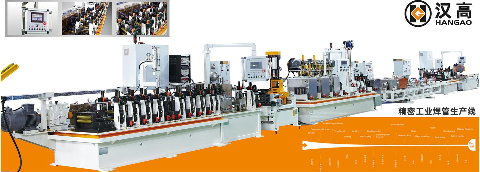經(jīng)開卷、清洗裝置、進料導(dǎo)向、成型、焊接、內(nèi)焊整平、外焊縫打磨、整形定徑、固熔處理、終定徑、校直、探傷、噴碼、定尺、切斷(盤卷)、接料等連續(xù)成型工藝、結(jié)構(gòu)精細、操作簡便